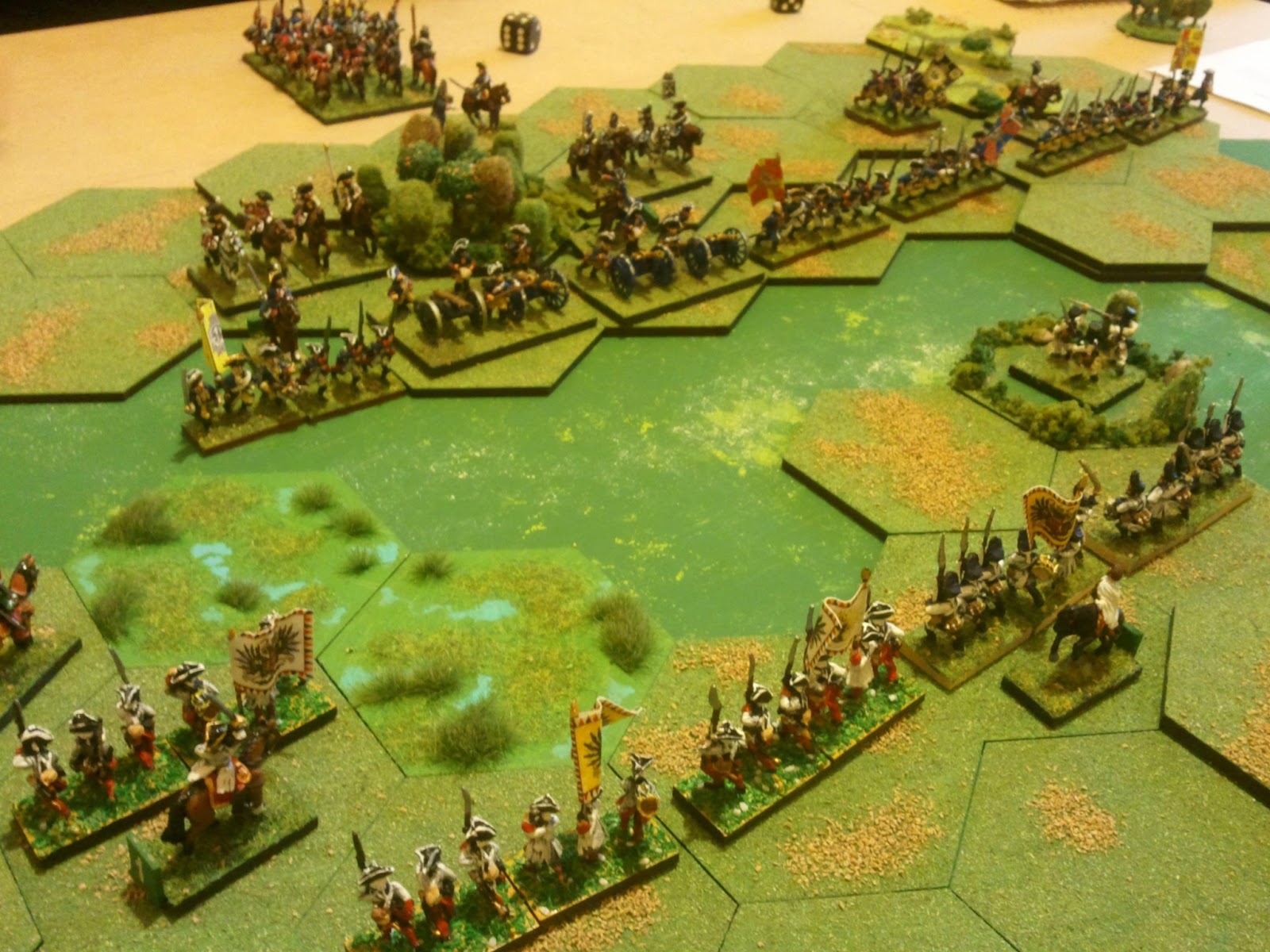 Turn 3. Diego has successfully repulsed the Austrian push on his right flank and is counterattacking with his heavy cavalry. See those blue cups? They contain 100 dice each, and players use those dice for any roll required by the game. When they finish, night falls.